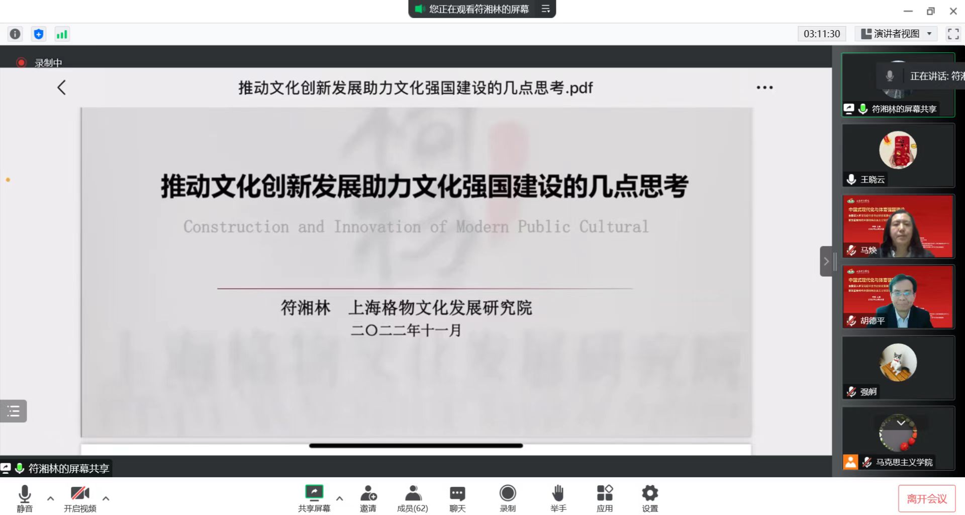 在主题研讨阶段,上海外国语大学中国国际舆情研究中心副主任、博士生导师、新闻传播学院吴瑛教授,中共中央党校(国家行政学院)党建教研部强舸教授,国家文旅部文化和旅游公共服务专家委员会委员、国家文化馆发展研究院学术委员、上海格物文化发展研究院院长符湘林,上海人工智能实验室治理研究中心副主任王迎春研究员,人民日报社人民论坛杂志社《国家治理》周刊副主编王克博士,财政部中国财政科学研究院教科文研究中心助理研究员、中国人民大学产业经济与竞争政策研究中心研究员周孝博士,上海体育学院太阳成集团tyc33455李金早副教授、张玮玮副教授分别作交流发言,上海体育学院太阳成集团tyc33455副院长马焕副教授主持主题研讨。