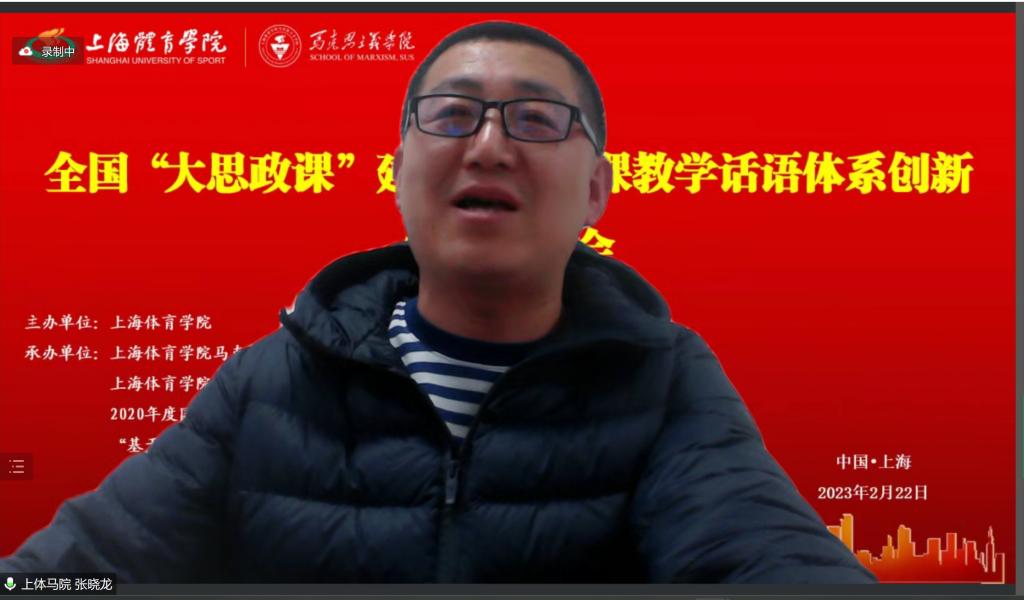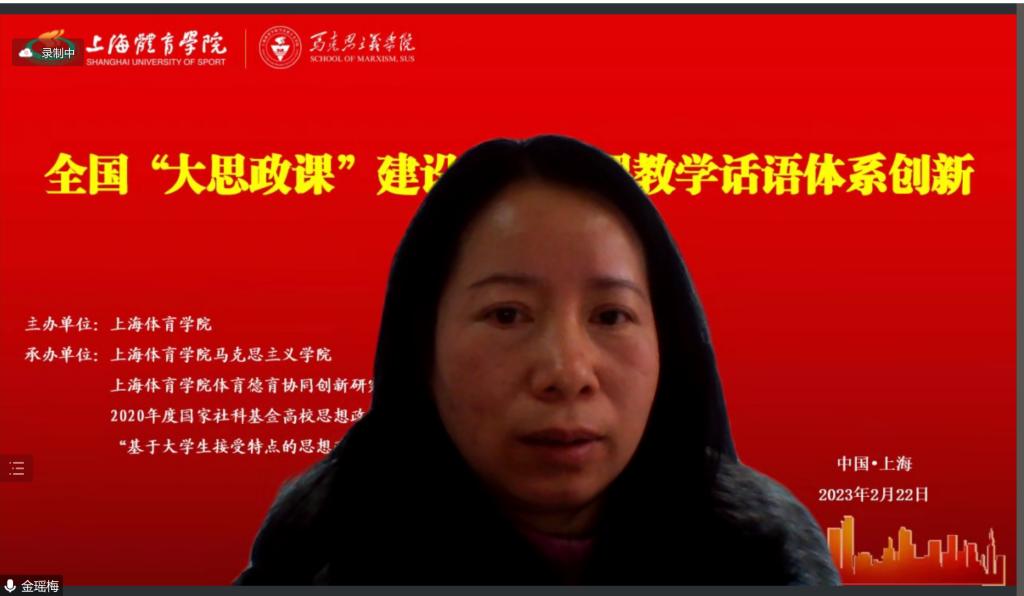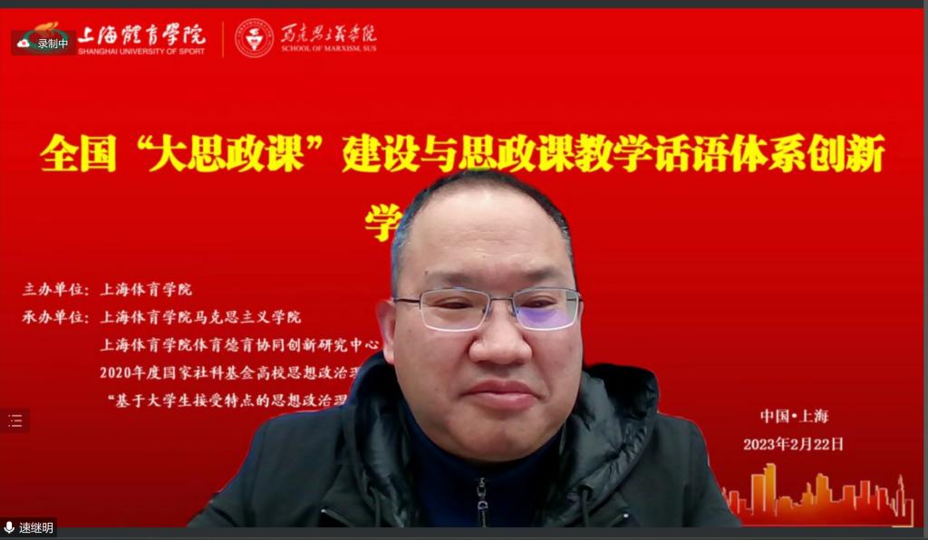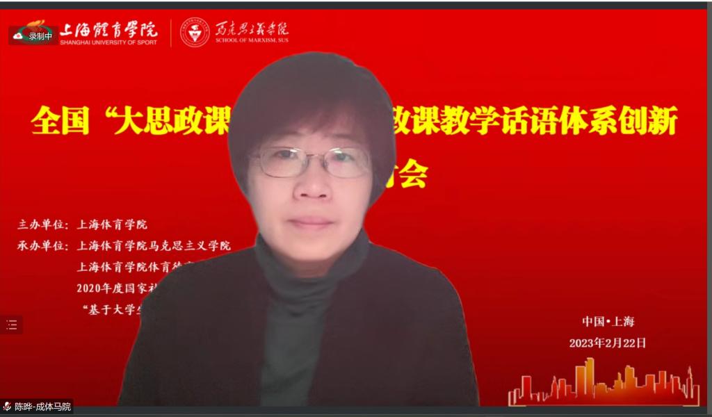 主题研讨第二阶段由上海体育学院太阳成集团tyc33455杨琼教授主持。上海中医药大学太阳成集团tyc33455院长、上海市高校思政课教学指导委员会委员、上海高校思政课“名师工作室”主持人王芳教授,成都体育学院太阳成集团tyc33455院长、四川省高校研究生思政课教研会副会长陈晔教授,华东师范大学太阳成集团tyc33455副院长、上海市习近平新时代中国特色社会主义思想研究中心研究员、国家社科基金重大项目首席专家速继明教授,上海体育学院太阳成集团tyc33455张晓龙副教授和敖天颖副教授分别作主题研讨。