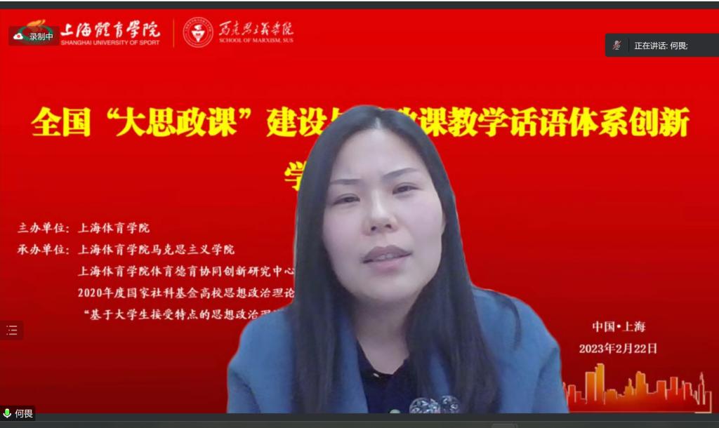 敖天颖副教授结合“中国近现代史纲要”课的教学,对思政课教学话语创新作了思考。她认为,要拓宽课堂空间,根据不同教学情境运用不同教学话语;要彰显学校特色,适当融合体育教学话语,比如基于纲要课课程内容,重点打造了“《体育之研究》”“红色体育”“乒乓外交”等专题;要聚焦历史认知,防范历史虚无主义话语。“大思政课”一定要跟现实结合起来。当下青年学生在历史认知问题上,比较容易受到碎片化、娱乐化的历史虚无主义话语的影响。纲要课教学要在辨清历史事实的基础上端正历史认知,防止学生落入历史虚无主义的话术圈套。