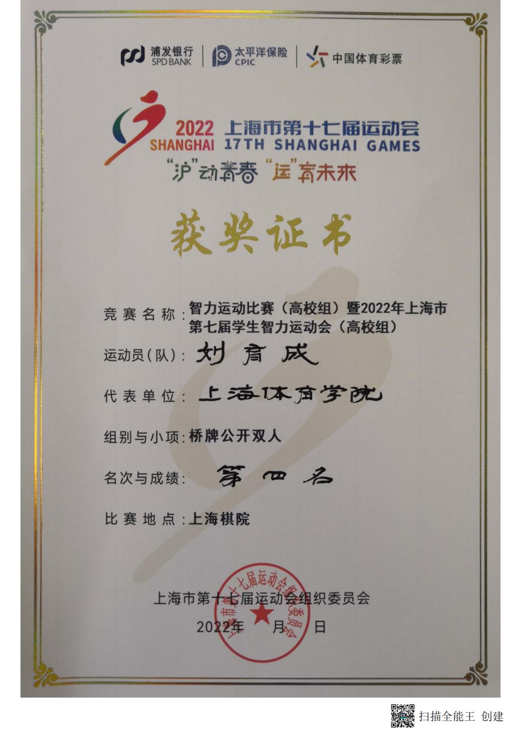 3月18日,我院组织学生参加了由上海市体育局、上海市教育委员会主办的“浦发银行&太平洋保险”杯上海市第十七届运动会智力运动比赛(高校组)暨2022 年上海市第七届学生智力运动会,刘育成、何敏获得桥牌双人赛第四名的成绩。