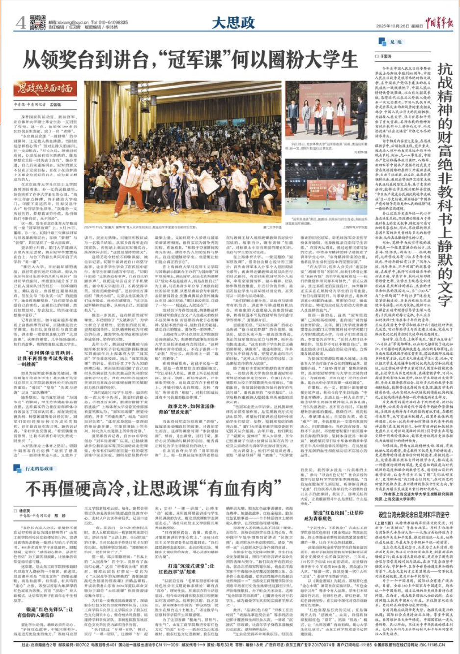 10月26日,《中国青年报》以《从领奖台到讲台,“冠军课”何以圈粉大学生》为题,对我校打造的“冠军思政课”进行了深度报道,引发社会广泛关注。该报道充分肯定了我校充分挖掘体育育人资源,将冠军精神、体育精神融入思想政治教育,打造“冒热气、接地气、聚人气”思政金课的创新举措与显著成效。