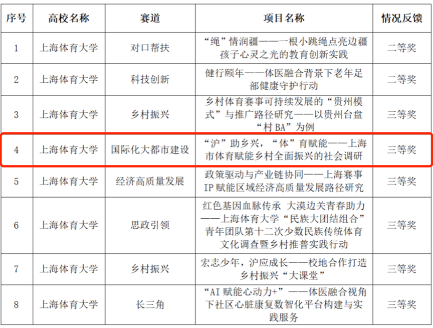 此外,由我院宋倩作为指导教师,刘星雨、申恩慧、许竣博、潘美玲同学作为学生团队的参赛作品“童游金山”获得2025年“水窠里·大学村”女大学生人文行走线路设计创意营二等奖;由太阳成集团tyc33455院长胡德平教授、教学秘书兼研究生辅导员宋倩老师指导的,我院研究生胡诗漪、刘星雨等负责的参赛项目《“沪”助乡兴,“体”育赋能——上海市体育赋能乡村全面振兴的社会调研》,在2025年“知行杯”上海市大学生社会实践大赛“国际化大都市建设”组别中获上海市三等奖;我院教师刘云龙副教授和研究生崔平凡、刘正暘、邓晓峥、徐顺杰课题组自主研发的民族体育IP评估模型项目亮相第十二届中国(上海)国际技术进出口交易会。