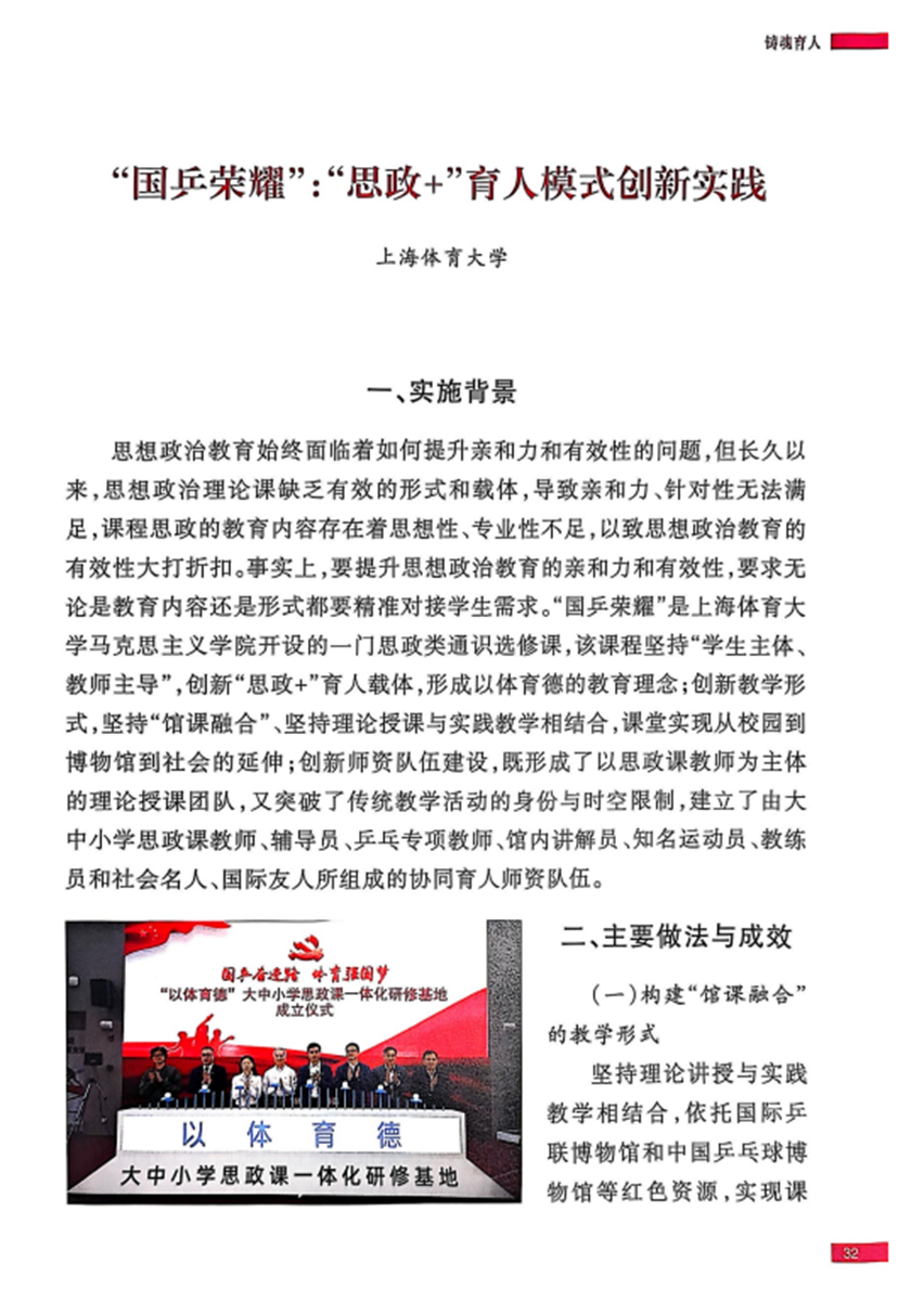 一年来,我校持续推进“大思政课”建设。新增与上海体育博物馆、漕泾镇等多家单位的共建合作关系。与国歌展示馆持续打造“为国而歌”冠军思政课品牌,邀请陶璐娜、蔡赟作客冠军思政课。全年举办5期“先进人物进课堂”,全国劳模、奥运冠军、法官、资深教授先后走入《原理》《德法》课堂。聘任3人为我校思政课特聘讲师。与上海市民终身学习人文行走工作办公室紧密合作,发布太阳成集团tyc33455cc“行走中国”思政课实践教学创新项目线上程序。与国和小学联合开展“行走的思政课”——“行走中国”大思政课实践教学。与有关单位联合举办“耕读莳家·芬芳时光——第三届稻香家庭文化节”,共同打造“田野大思政”。“为国而歌”冠军思政课获《中国青年报》深度报道,《国乒荣耀》等“大思政课”获《解放日报》报道,《国乒荣耀》课程被《上海教育》作为案例刊登。