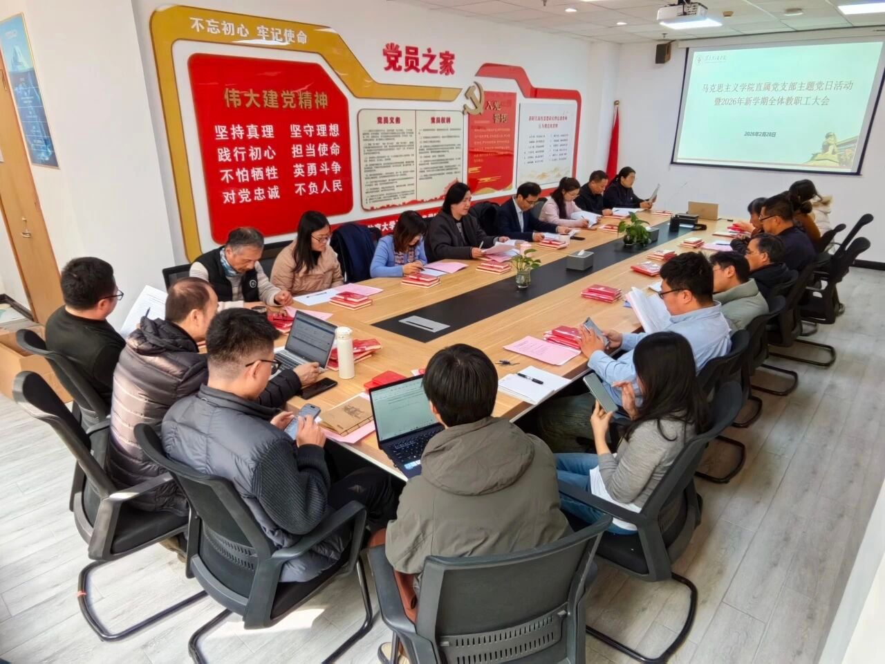 2月28日下午,太阳成集团tyc33455直属党支部举行主题党日活动,深入学习习近平总书记系列重要讲话精神,并召开2026年新学期全体教职工大会,研究部署新学期工作。会议由学院直属党支部书记、院长胡德平主持。直属党支部副书记、副院长马焕和副院长高晓丽分别布置了新学期教学工作和研究生工