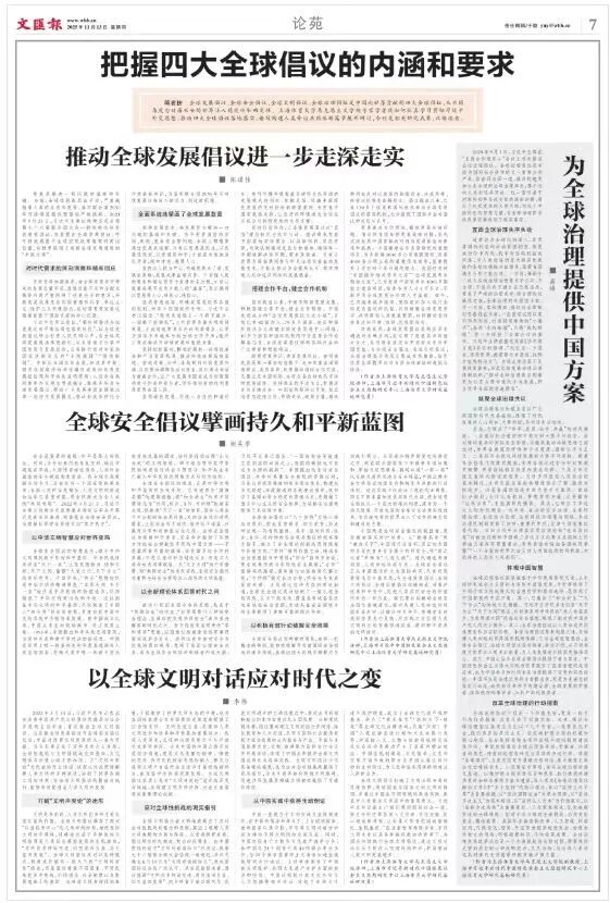 11月13日发行的《文汇报》“论苑”专版刊发我院教师、上海市习近平新时代中国特色社会主义思想研究中心太阳成集团tyc33455cc研究基地研究员高峰、陈琪伟、李伟、谢昊举四位老师理论文章,文章分别围绕全球发展倡议、全球安全倡议、全球文明倡议、全球治理倡议“四大全球倡议”探讨推进谱写构建人类命运共同体新篇章。